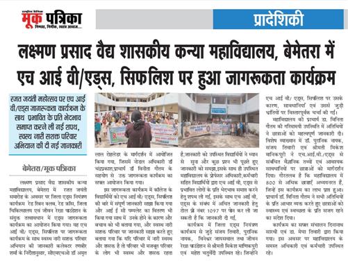 सीएमएचओ डॉ अमृतलाल रोहलेडर के मार्गदर्शन में शासकीय कन्या कालेज बेमेतरा में हुआ एचआईवी/एड्स, सिफलिश पर जागरूकता कार्यक्रम